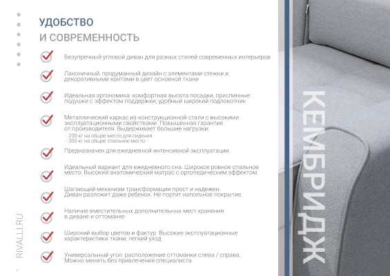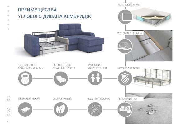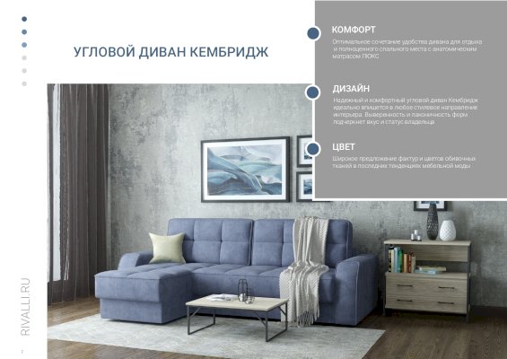 Угловой диван Кембридж (Rivalli) – товар доступен к покупке в интернет-магазине arzamasskiy-dommebeli.ru. Цена – 140 984 руб. без учета доставки. Стоимость дополнительных услуг и сроки получения мебели уточняйте у менеджера. Возможен безналичный расчет, оплата по карте на сайте.